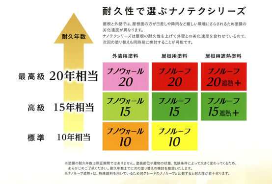 | 最高級20年相当 ナノテク無機系フッ素樹脂塗料 シリーズ中最高の耐久性を発揮する 最高級無機系フッ素グレード 15年の高耐久性 ハイグレードナノシリコン樹脂塗料 最高峰の耐久性を発揮する 高級シリコングレード 10年の耐久性 ナノシリコン樹脂塗料 コストバランスを重視しながらも 高性能な標準シリコングレード |